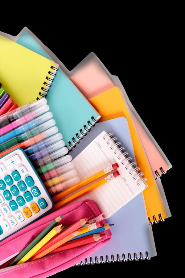 Prepare for the school year with this comprehensive set of school supplies. This collection includes multiple spiral notebooks in vibrant colors, a pink pencil case, pencils, a calculator, and a variety of markers or colored pens. Perfect for students of all ages, this set ensures you have everything you need for a successful academic year. Please note, we only sell these school supplies as wholesalers.